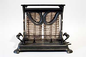 Wow. What a toaster! Body, base and top are heavy cast iron. It looks like a piece from 1700. But it's an electrical toaster found in England. On top a "P" and a "D".