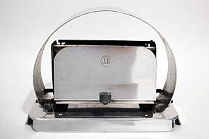 The J.B. toaster has a very unusual shaped "body": Its just a round bended sheet of aluminum. Pushing the handle down, opens the door. Very simpel, but solid made. Notice the big ceramic heating element.