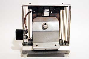 That's an example of rough shaped toaster made during or short after World War 2. Looks like improvised manufacturing. A similar toaster from an unknown company can be viewed in the Permanent Exhibition.