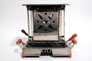 This rare Kalorik toaster is based on their first toaster. It has the same cast iron base and top, but different doors and handles. In our permanent exhibition is displayed the model three. Same doors and handles, but different base and top.