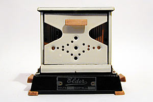 Very rare toaster from France. It has an black enameld base, white enameld body and wooden handles. Notice the unusual clay heating element.